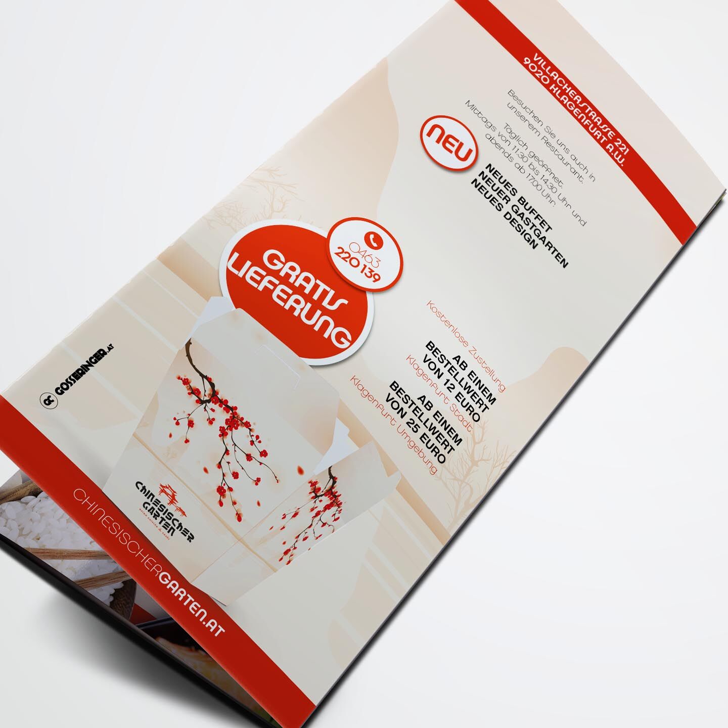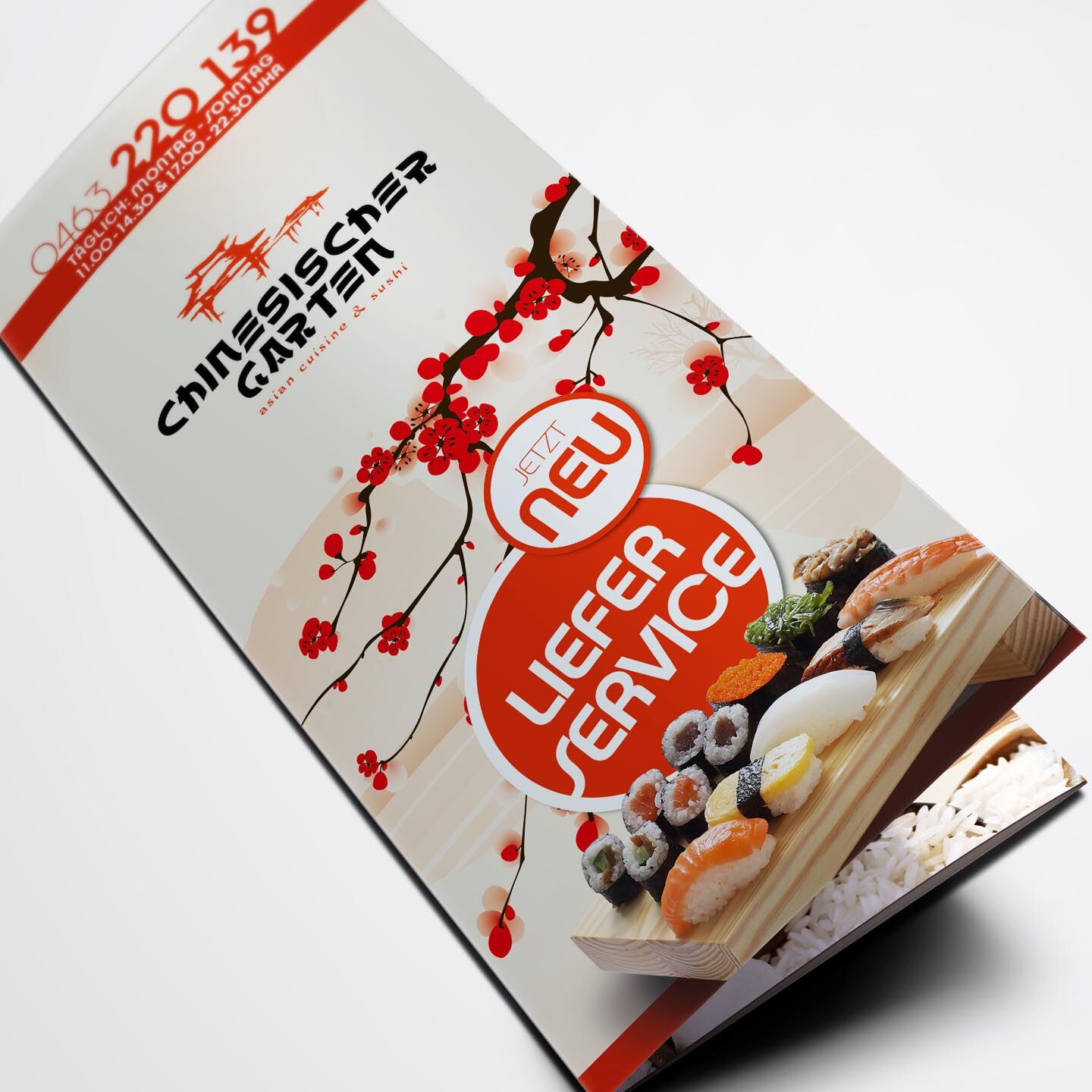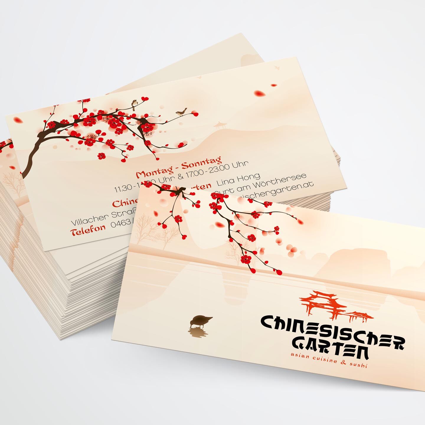 tradition kombiniert mit moderne. typisch chinesische elemente mit stilvoller typograhpie vereint lassen den chinesischen garten in einem neuen, klaren look mit asiatischen stimmungselementen erscheinen. restaurant und lieferservice teilen sich dabei eine einheitliche corporate werbelinie für eine starke, schnelle wiedererkennung.