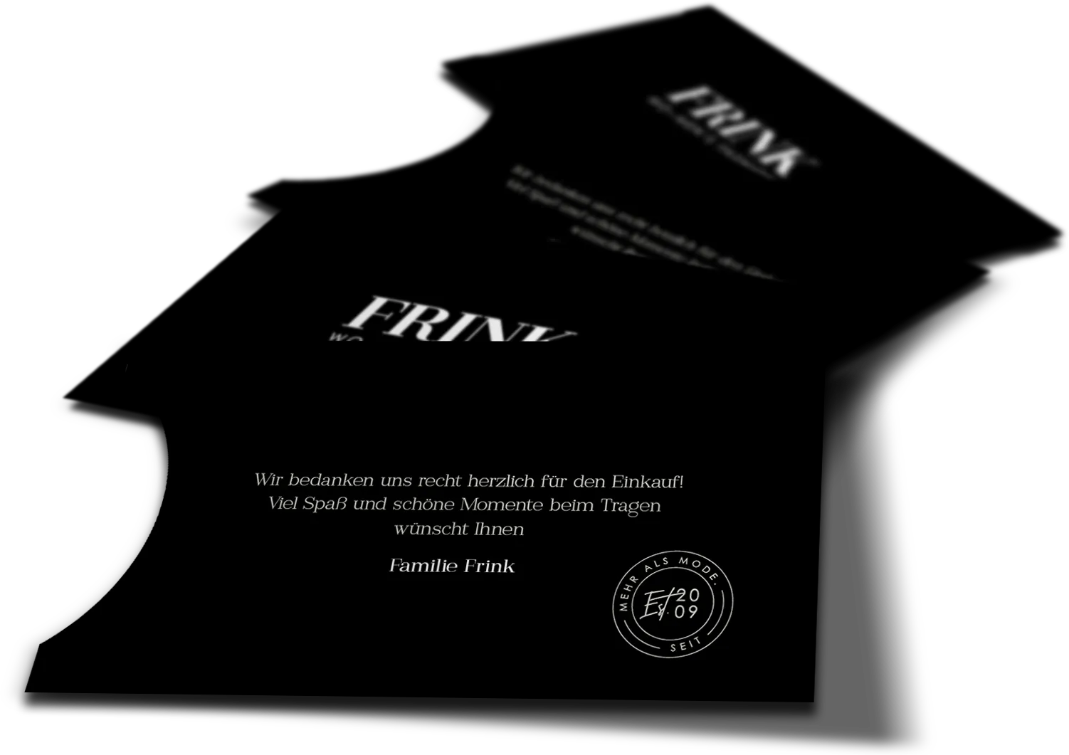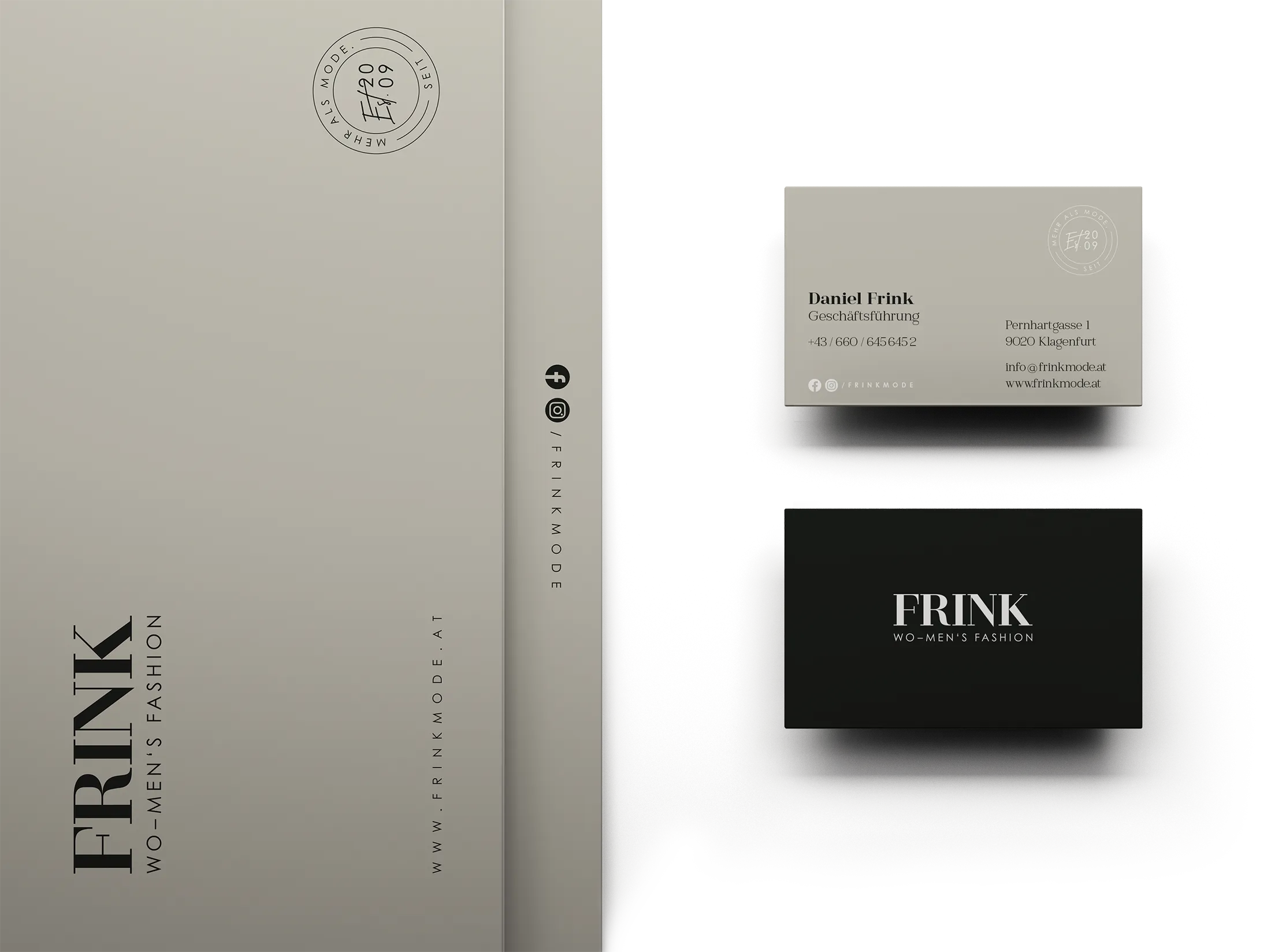 anlässlich des standortwechsels wurde ein komplette neuaufstelleung der marke "frink mode" erstellt. ein klares fashion label "frink – wo-men's fashion" wurde designt und mit einer stilvollen corporate designlinie umgarnt. mode seit 2009 by frink.